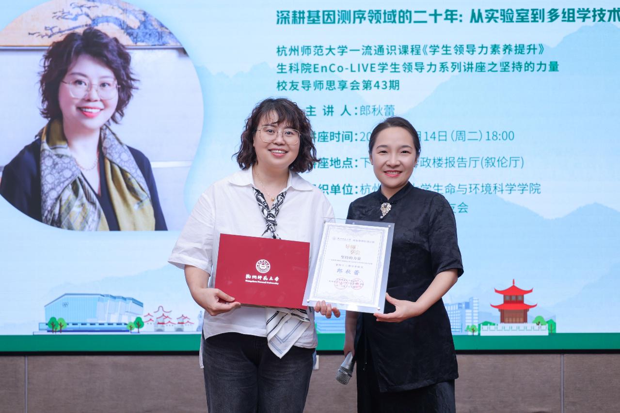 现场还进行了杭师大生科院“EnCo-LIVE学生领导力素养提升计划”导师及就业创业导师聘任仪式,生科院党委副书记王倩为郎秋蕾校友颁发聘书及“校友导师思享会”纪念牌,学生代表为其送上生科院学生制作的“永生花”摆件,并合影留念。