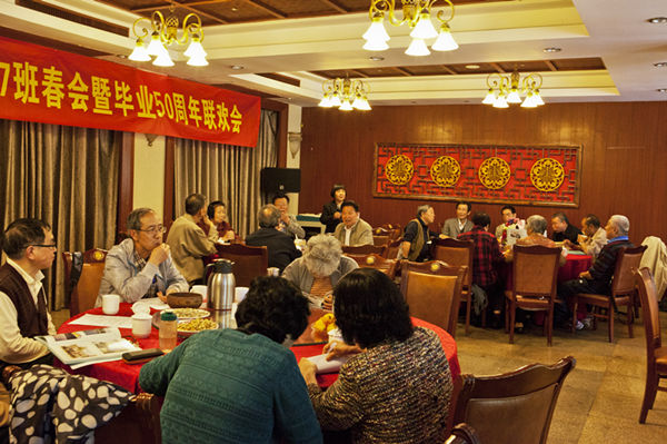 霏霏春雨隔不断浓浓的同学情、师生情。大家纷纷表示要将已形成制度的每年春秋两次聚会坚持下去,到毕业60周年再开一次联欢会。
