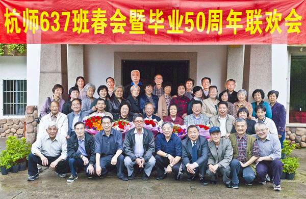 “嘹亮的钟声叮当叮当响,我们走进明亮的课堂……”一群白发苍苍的古稀老人唱着《教师之歌》,开始了他们的聚会活动。这是原杭州师范学校637班全体同学在举行纪念春会暨毕业50周年联欢会。应邀到会的有杭师大初等教育学院徐丽华院长和当年担任过该班班主任、任课老师的吕文升、胡俊杰、何根富、吴兴中等老教师及36位老同学。
